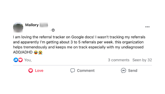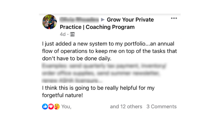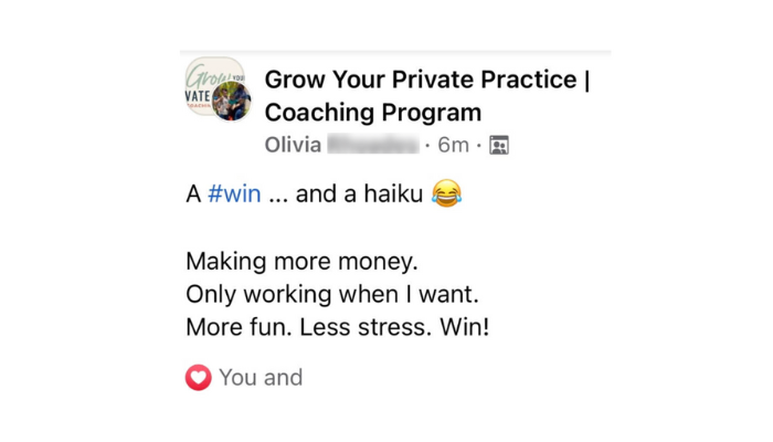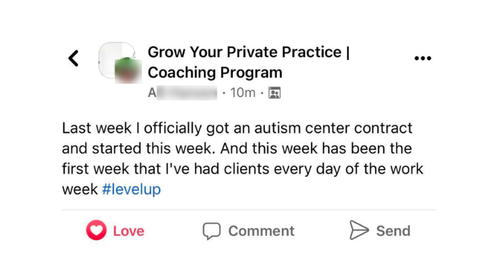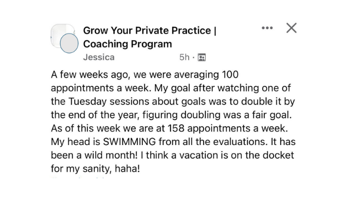 “Within 3 months of joining the Grow program, I grew my practice from part-time with 5 clients on my caseload to full-time with 22 clients. Within one year, I had passed 6 figures in income and had hired two employees – all while enjoying 4 day work weeks and extended vacations.”