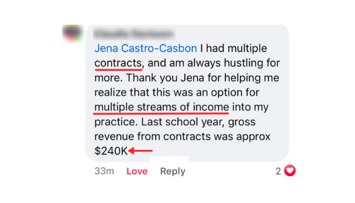 “Last school year, gross revenue from contracts was approx $240K. Thank you Jena for helping me realize that this was an option for multiple streams of income into my practice!”